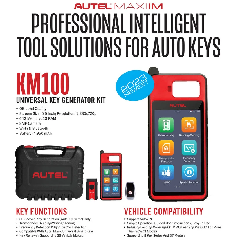 Autel MaxiIM KM100 (X) car key programmer is Autel first smart keytool. It integrates all key related functions such as universal key generation, transponder reading/ writing/ cloning, IMMO learning in a compact design. Equipped with the MaxiVCI V200 wireless interface, 2 universal smart blank keys in package, you can get the one-stop solution from key generation to key learning. It is undoubtedly the best choice for locksmiths and home mechanics.